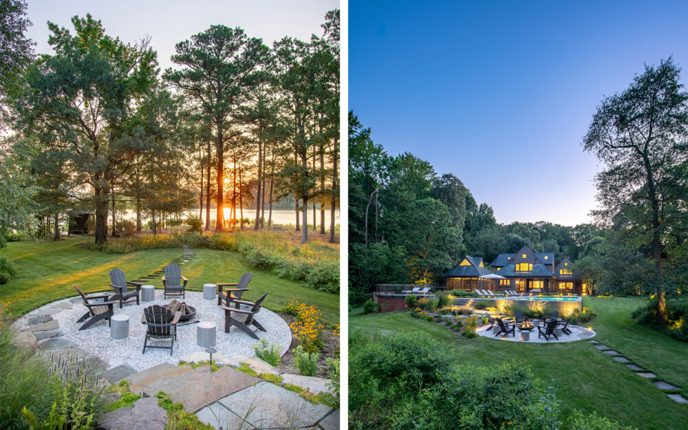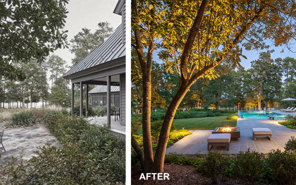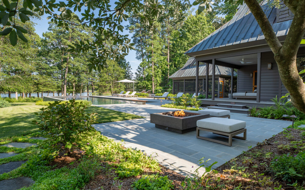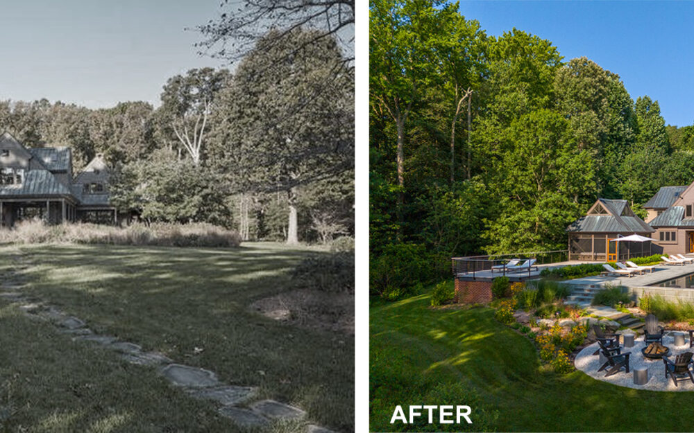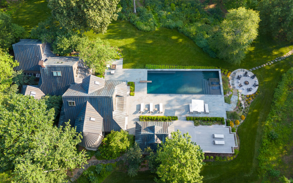 The clients’ primary request was a swimming pool, but also included a fire pit, a separate fire table terrace, new connections to an existing porch and grill terrace, lighting, irrigation and planting.