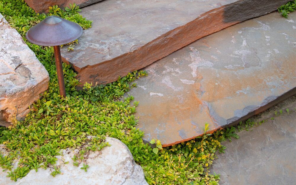 Walking off the pool deck to the fire pit, thermaled bluestone gives way to 6” thick boulder steps, flagstone paving, and fieldstone boulders. The fire pit itself is a crushed stone circle firmly ground at existing grade and edged with raw, field-welded steel.