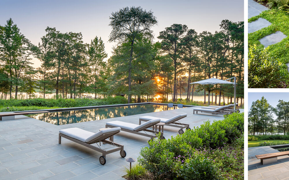 The monochromatic material palette includes thermaled Pennsylvania Bluestone laid in a running bond pattern on the pool deck, 2” thick pool coping, and veneer for the exposed outside of the 55’ long pool shell where it projects above grade. An automatic cover satisfies the 48” barrier rule and a wooden diving board adds some flare and material diversity.