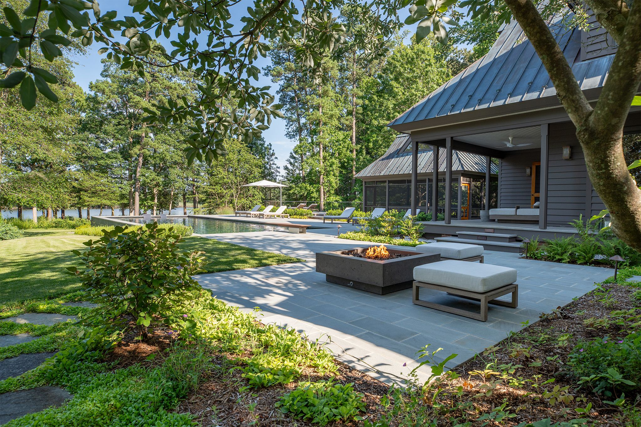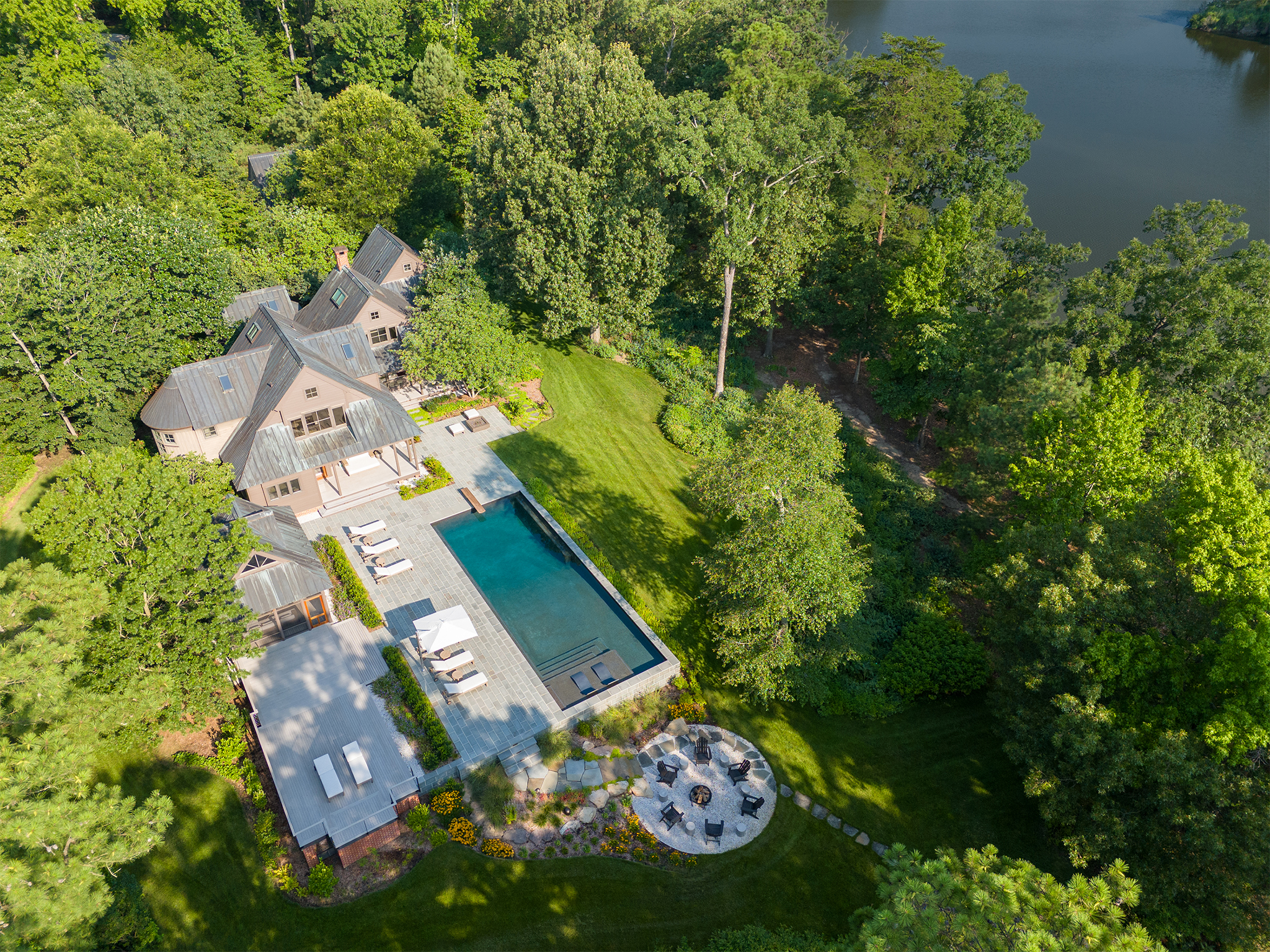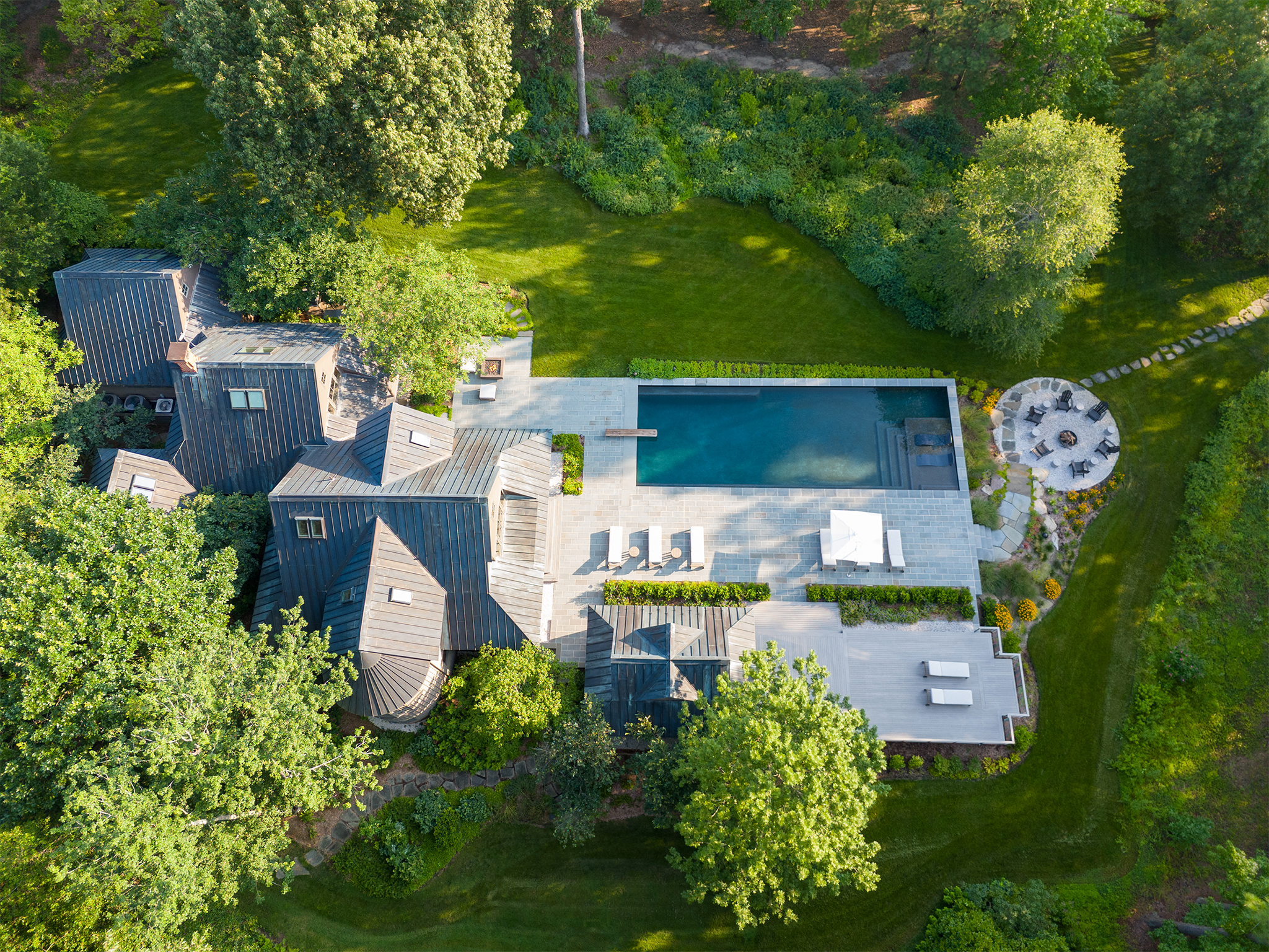 The clients’ primary request was a swimming pool, but also included a fire pit, a separate fire table terrace, new connections to an existing porch and grill terrace, lighting, irrigation and planting.