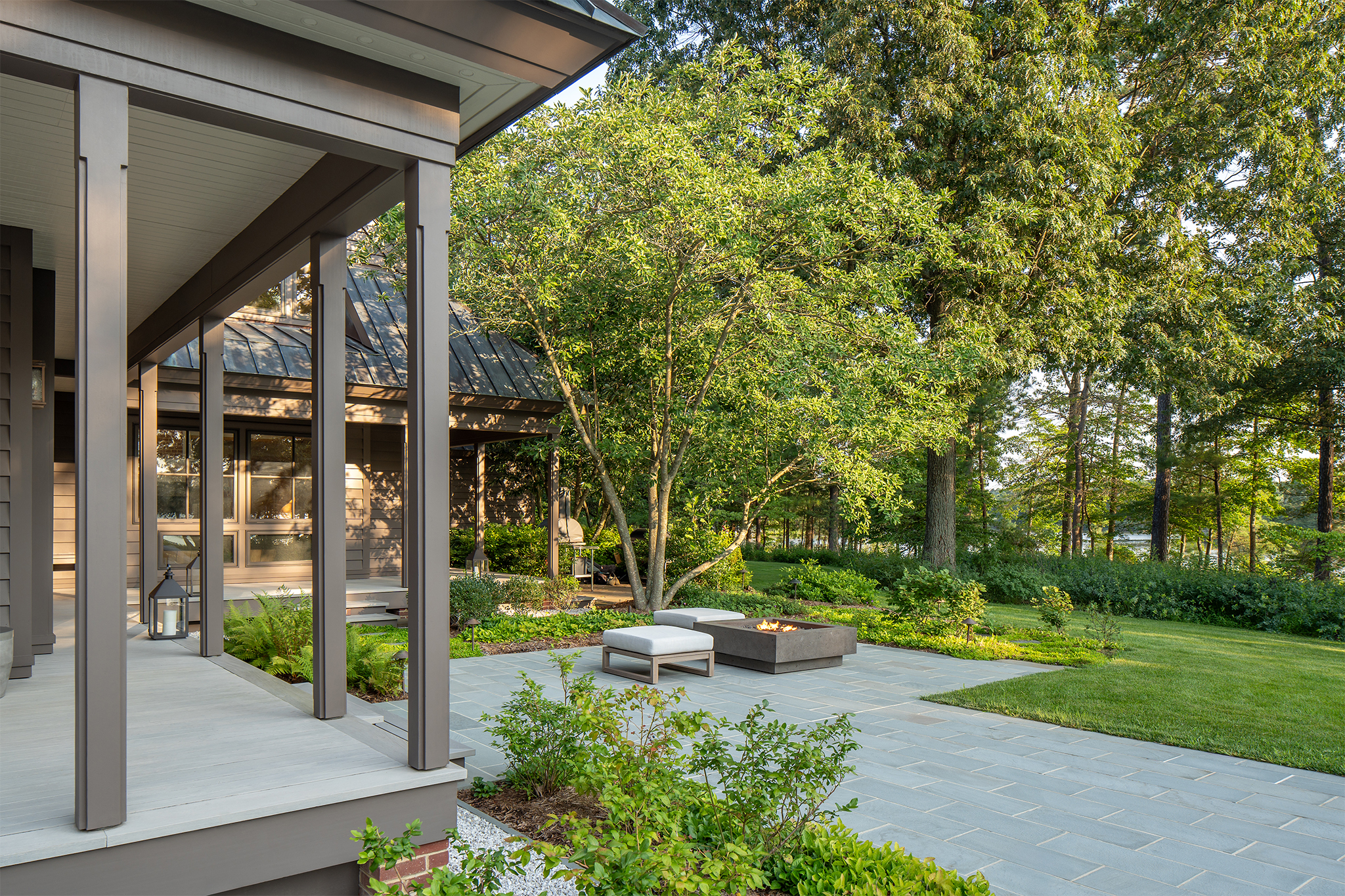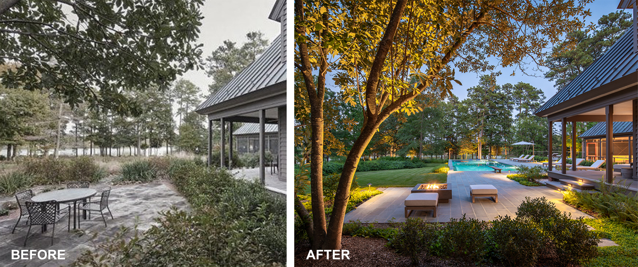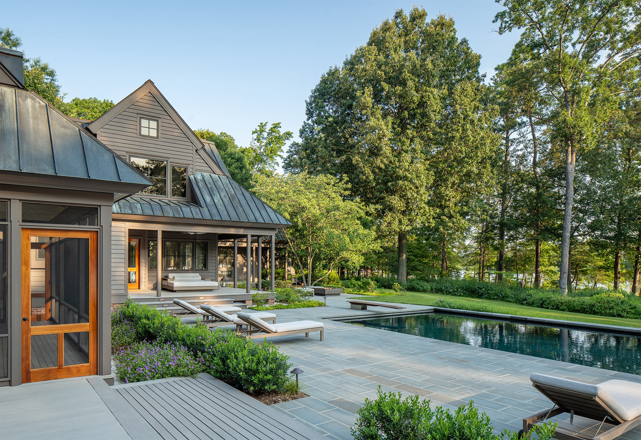 The clients’ primary request was a swimming pool, but also included a fire pit, a separate fire table terrace, new connections to an existing porch and grill terrace, lighting, irrigation and planting.