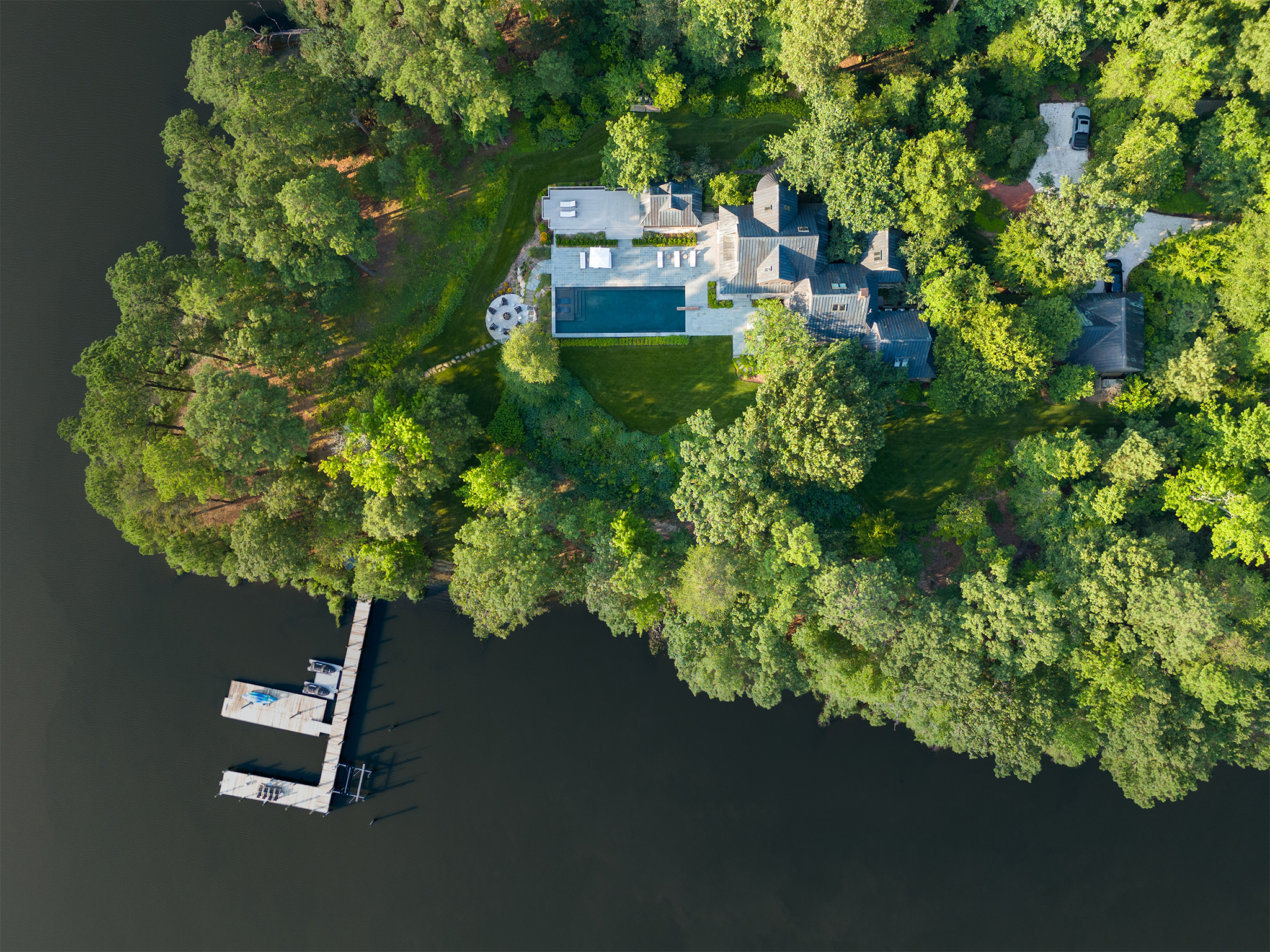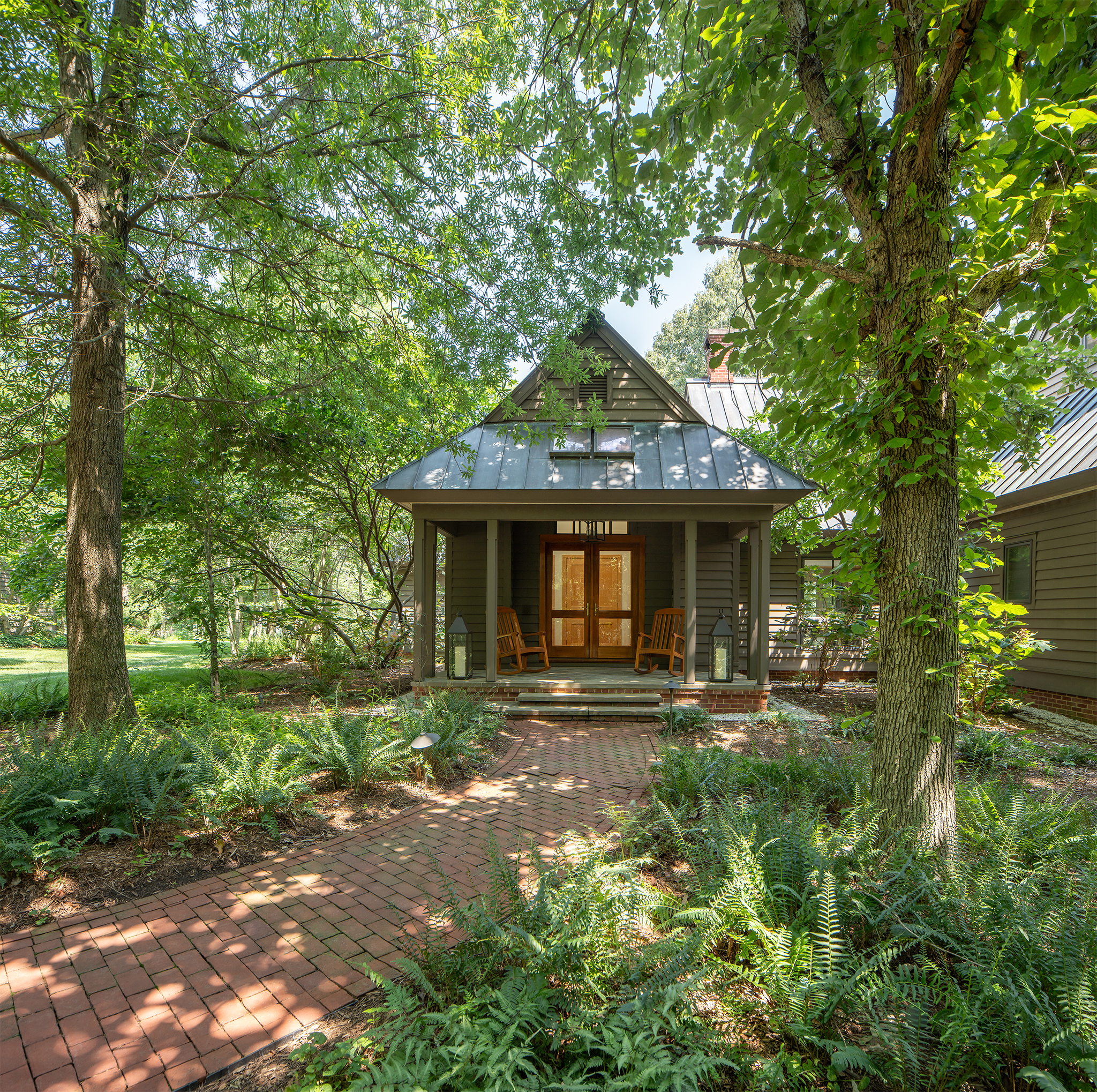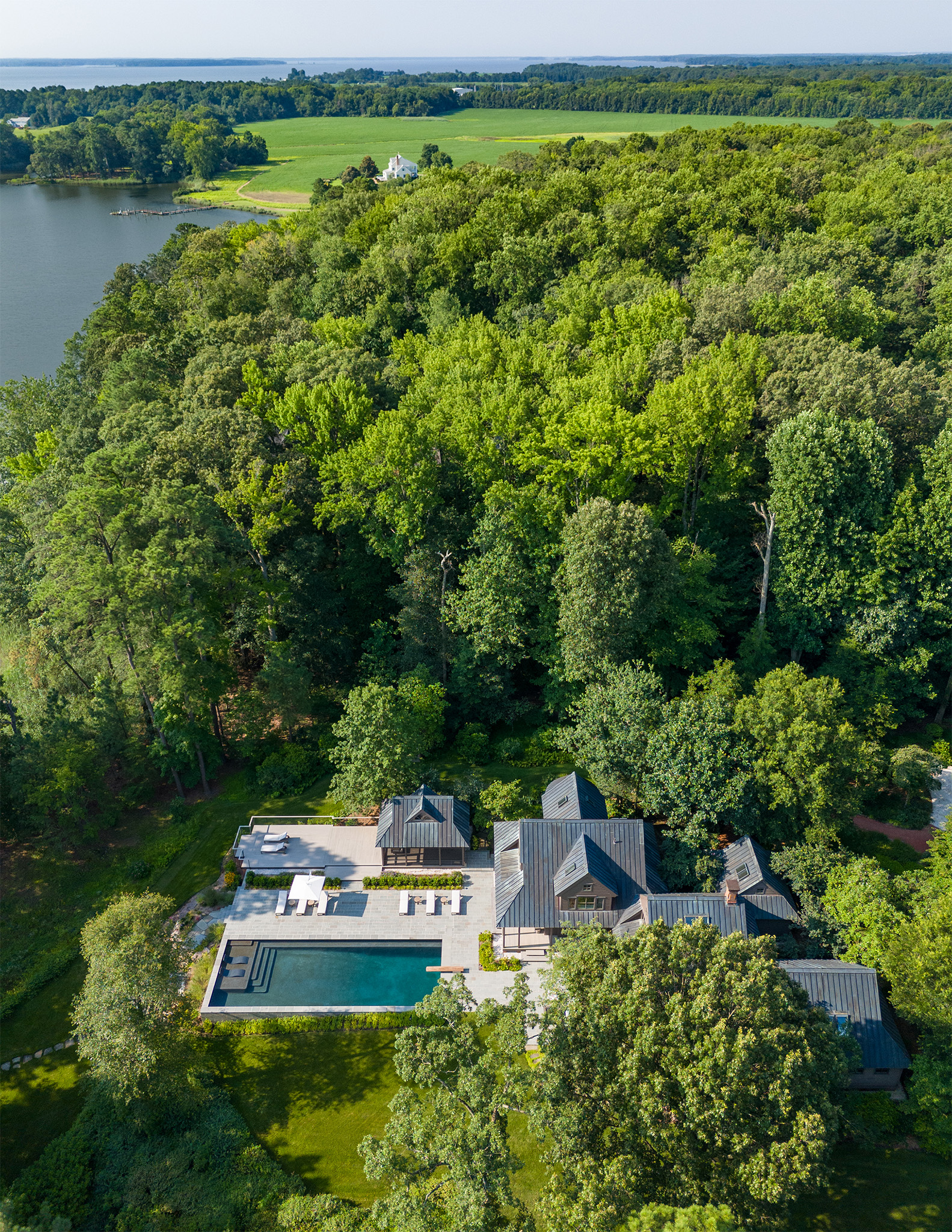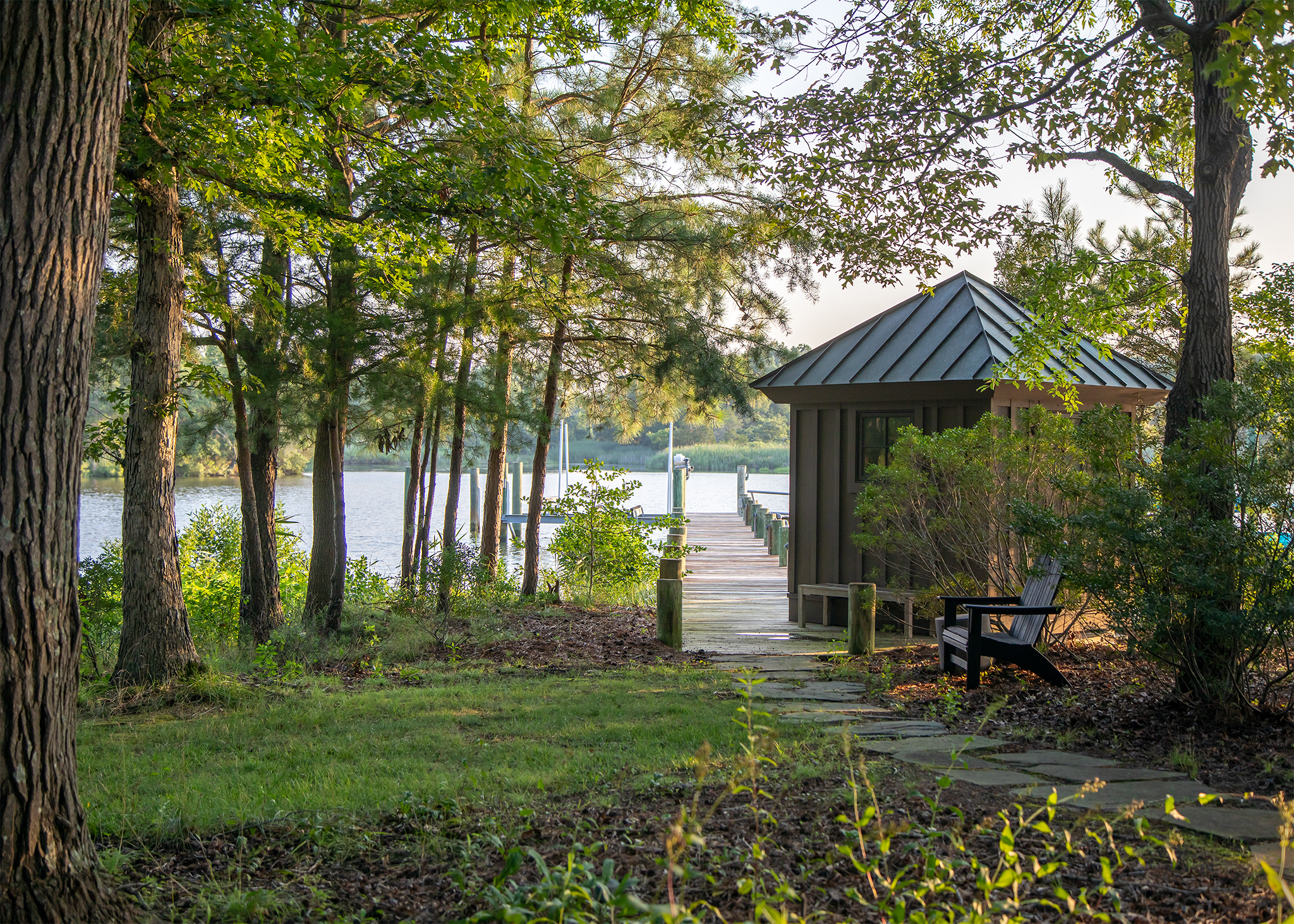 Set along a quiet peninsula in Rock Hall, MD this 55-acre waterfront property is mostly wooded. The house was designed by a local architect and provided strong architectural backdrop and inspirational precedent for the new landscape architecture.