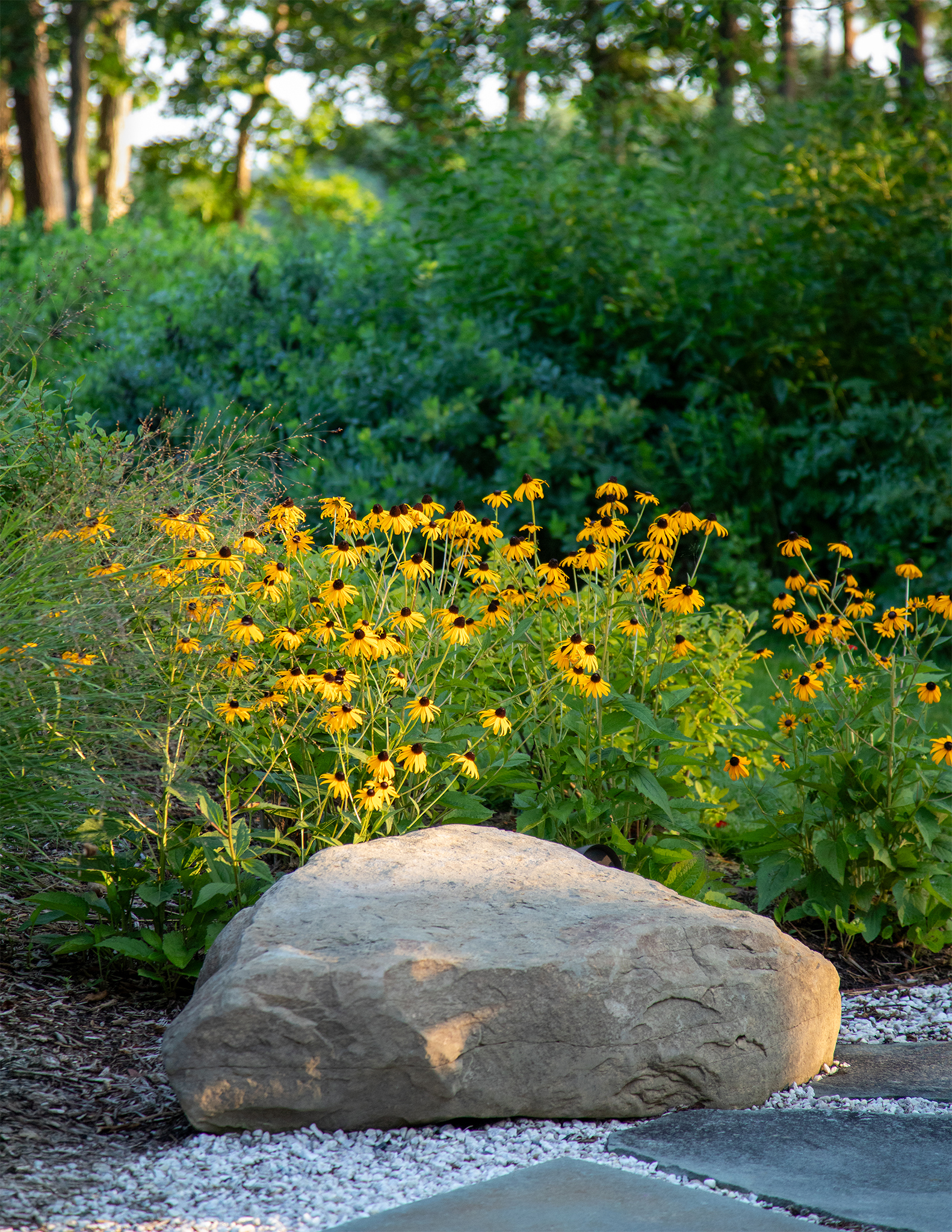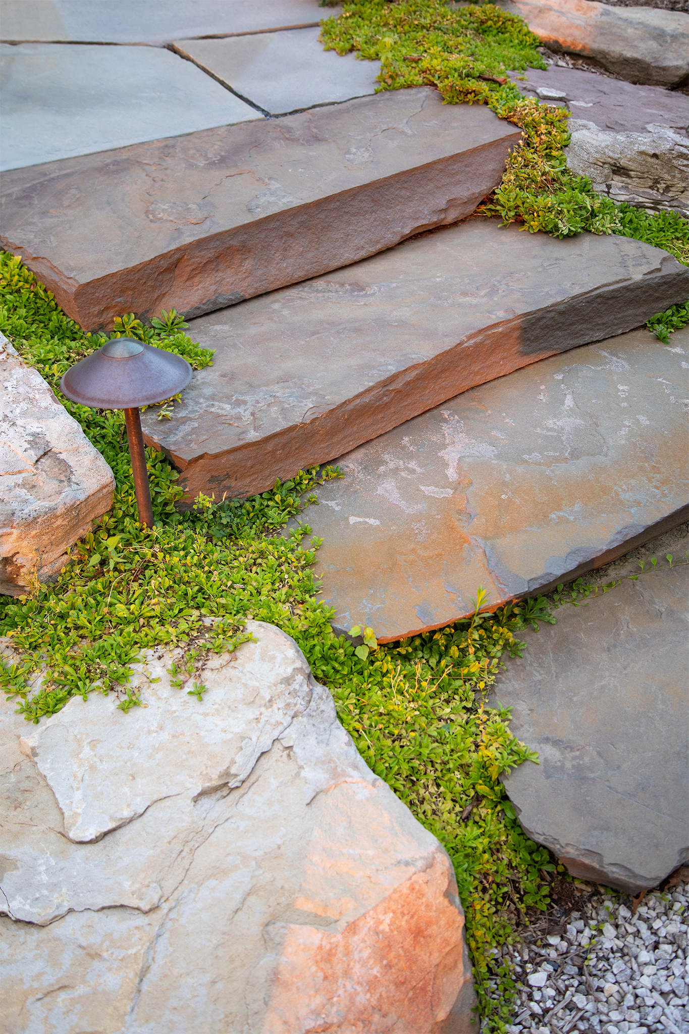 Walking off the pool deck to the fire pit, thermaled bluestone gives way to 6” thick boulder steps, flagstone paving, and fieldstone boulders. The fire pit itself is a crushed stone circle firmly ground at existing grade and edged with raw, field-welded steel.
