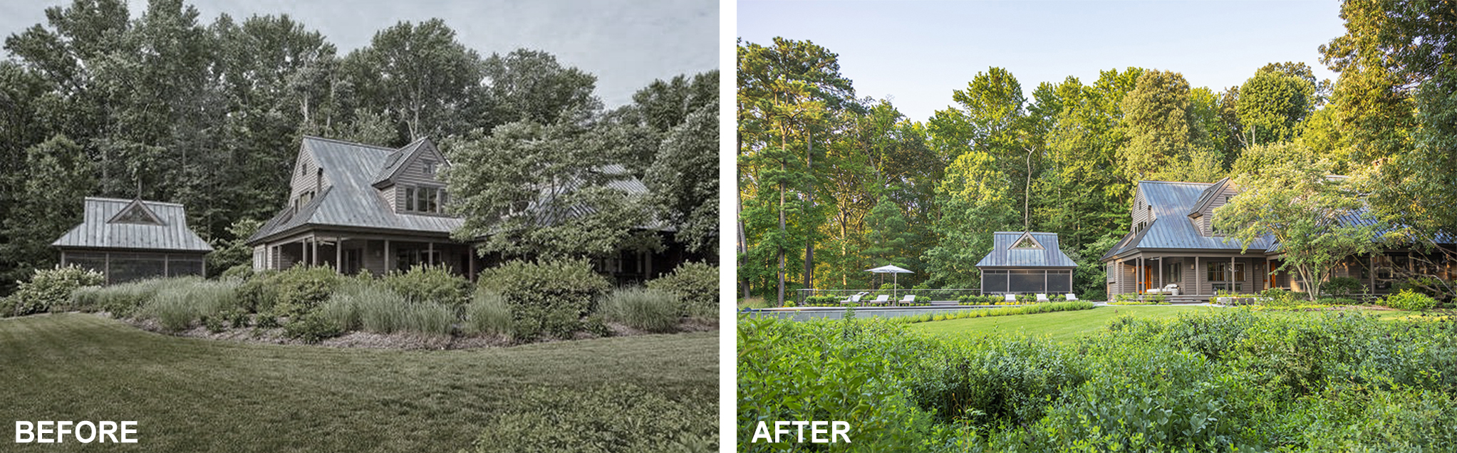New Landscape wraps the pool construction in native plants including Sweetbay Magnolia, Summersweet, Dwarf Fothergilla, Elderberry, Viburnum, Ferns, Golden Ragwort, Black-Eyed Susan, and Switchgrass among many others.
